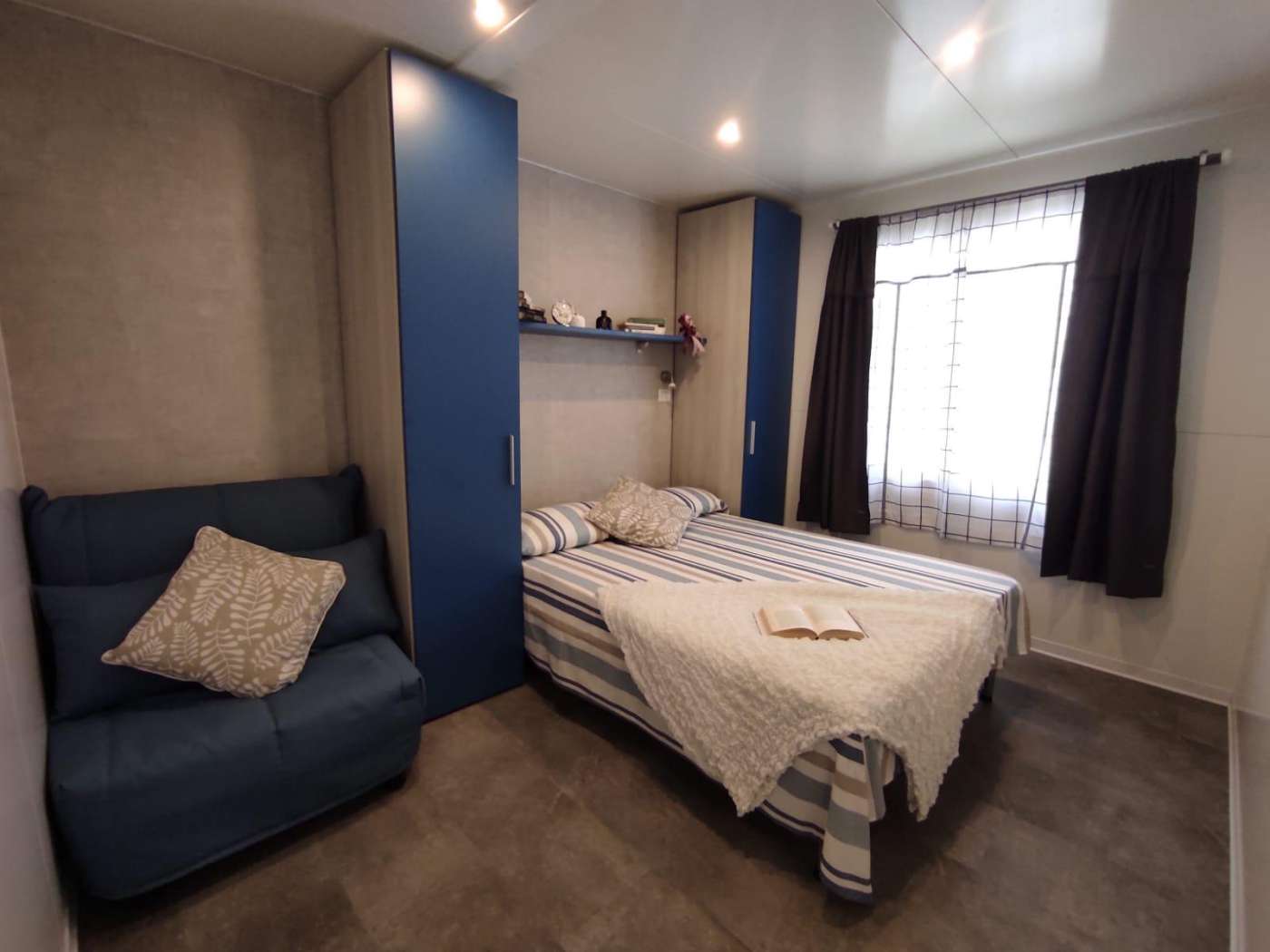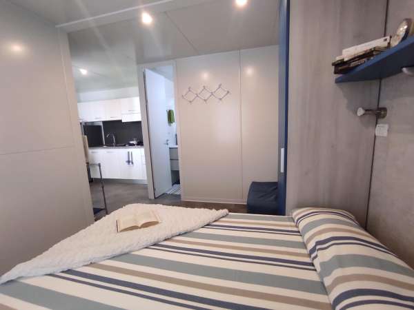 Lilly Pineta Camping verfügt über Maisonetten für zwei Personen, die sich durch einen offenen Raum mit Doppelbett, Küchenzeile, komplettem Badezimmer und Veranda auszeichnen.